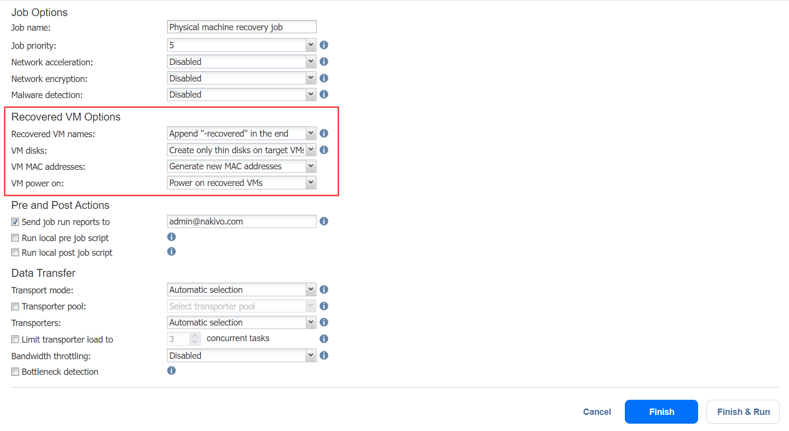 En la página Opciones, configure las opciones del job de recuperación de máquinas físicas.