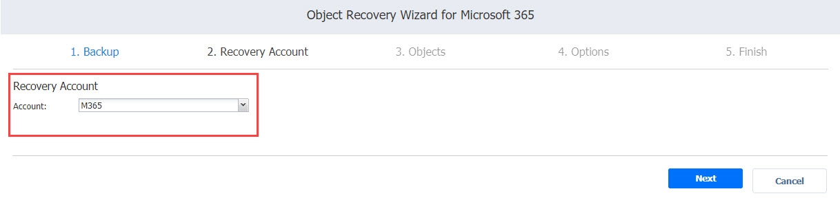 En la página Cuenta de recuperación , especifique la cuenta de Microsoft 365 en la que desea recuperar los elementos. Puede elegir recuperar en un buzón de Exchange en línea específico, OneDrive para la Empresa o un sitio de SharePoint más adelante en el asistente. Seleccione la cuenta necesaria de la lista desplegable Cuenta . La lista contiene todas las cuentas de Microsoft 365 añadidas al inventario. Consulte Añadir cuentas de Microsoft 365 para obtener más detalles.