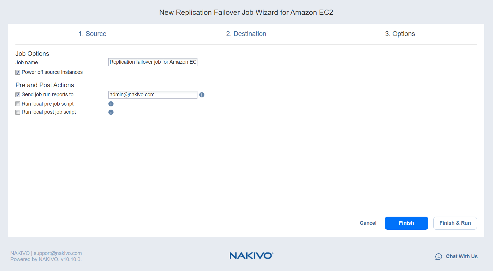 Apagar instancias de origen: Seleccione esta casilla de verificación para apagar las instancias de Amazon EC2 de origen cuando haya finalizado el job de conmutación por error.