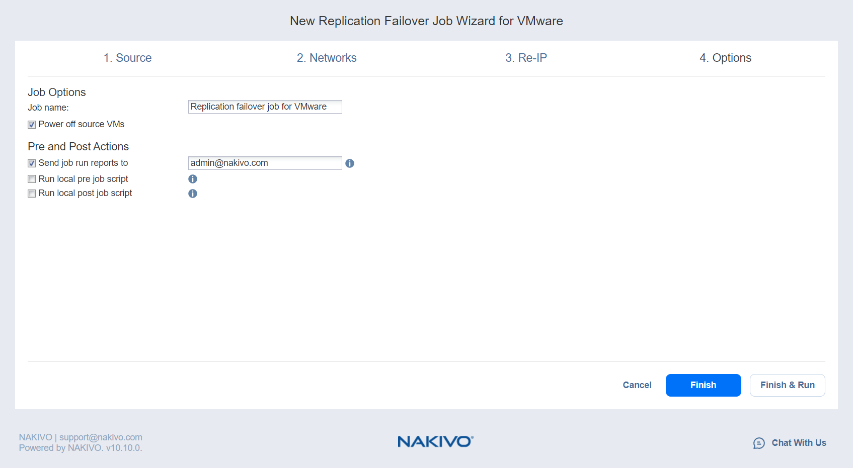 1. enviar los informes de ejecución del job a: Cuando se selecciona esta opción, se envía un informe de jobs a los destinatarios especificados cada vez que finaliza el job de conmutación por recuperación. Esto anula el ajuste por defecto en los ajustes de NAKIVO Backup & Replication.