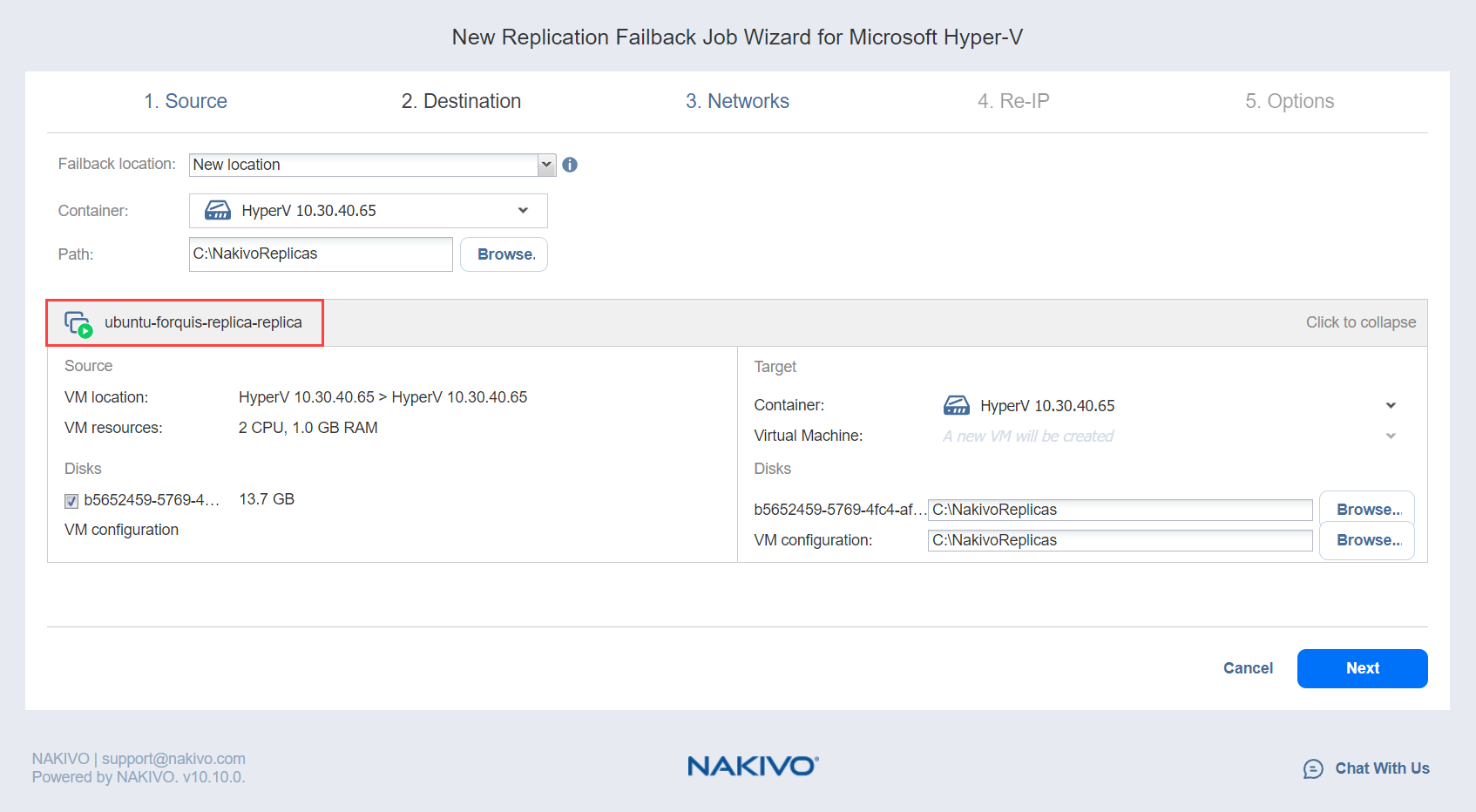 Asistente de conmutación por error de jobs para Microsoft Hyper-V: Destino