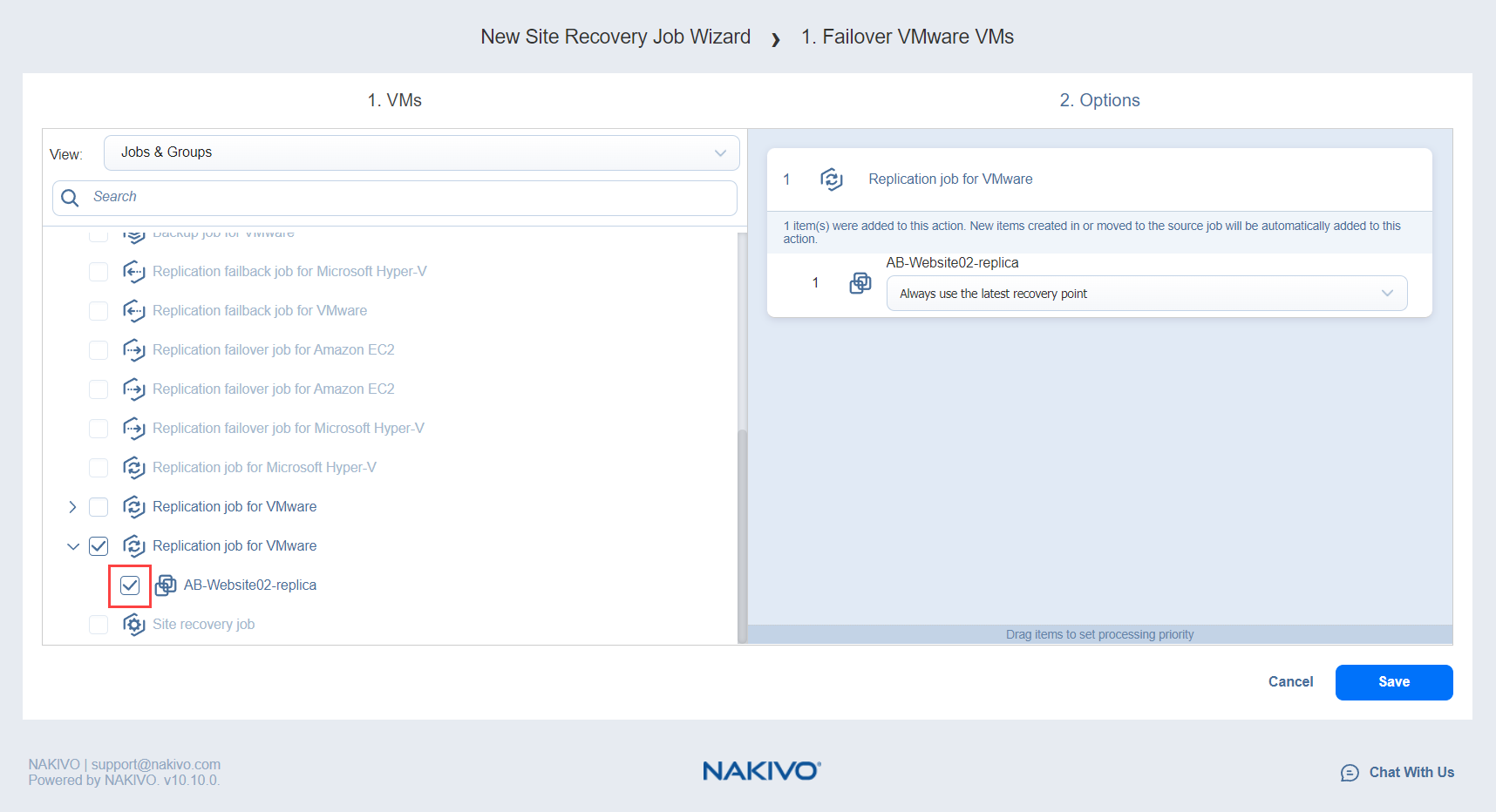 Consulte las siguientes secciones sobre cómo añadir una acción de máquina virtual de VMwares de conmutación por error a su job de restauración del entorno: