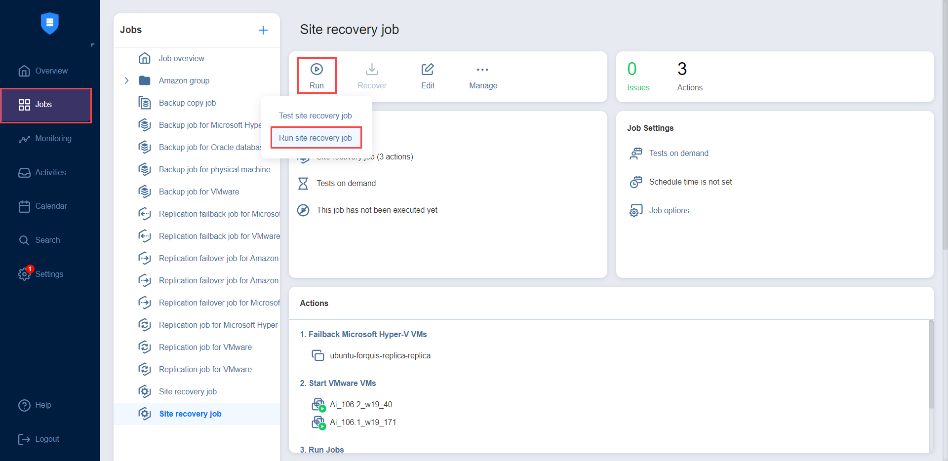 1. En el menú Jobs, seleccione su job de restauración del entorno y haga clic en el botón Ejecutar jobs.
