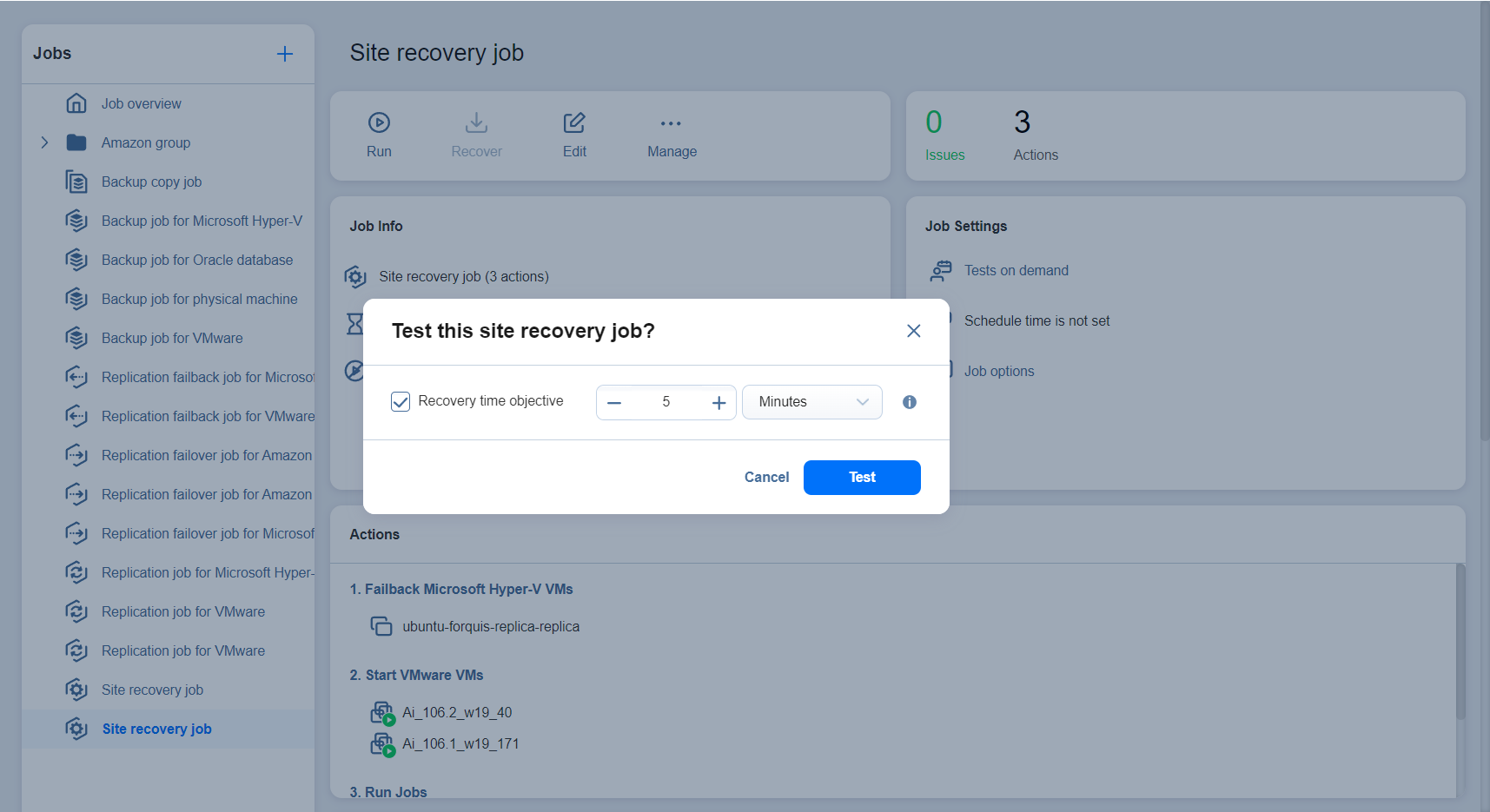 Además de probar el job de restauración del entorno bajo demanda, también se pueden programar pruebas. Consulte Asistente de job de restauración del entorno: Programación de pruebas para obtener más detalles.
