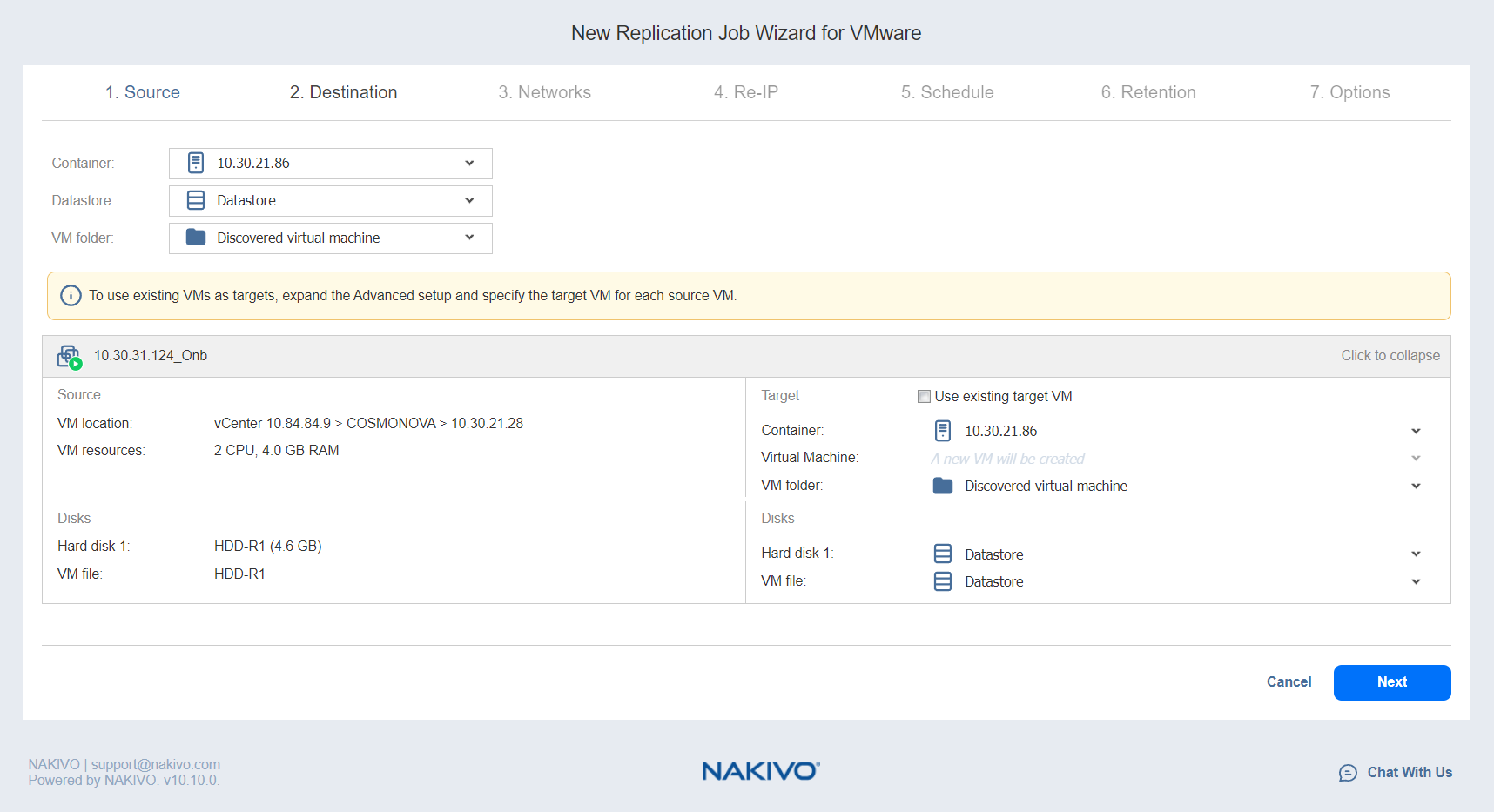 Abra la lista desplegable de máquinas virtuales de destino y seleccione la opción Usar la máquina virtual de destino existente .