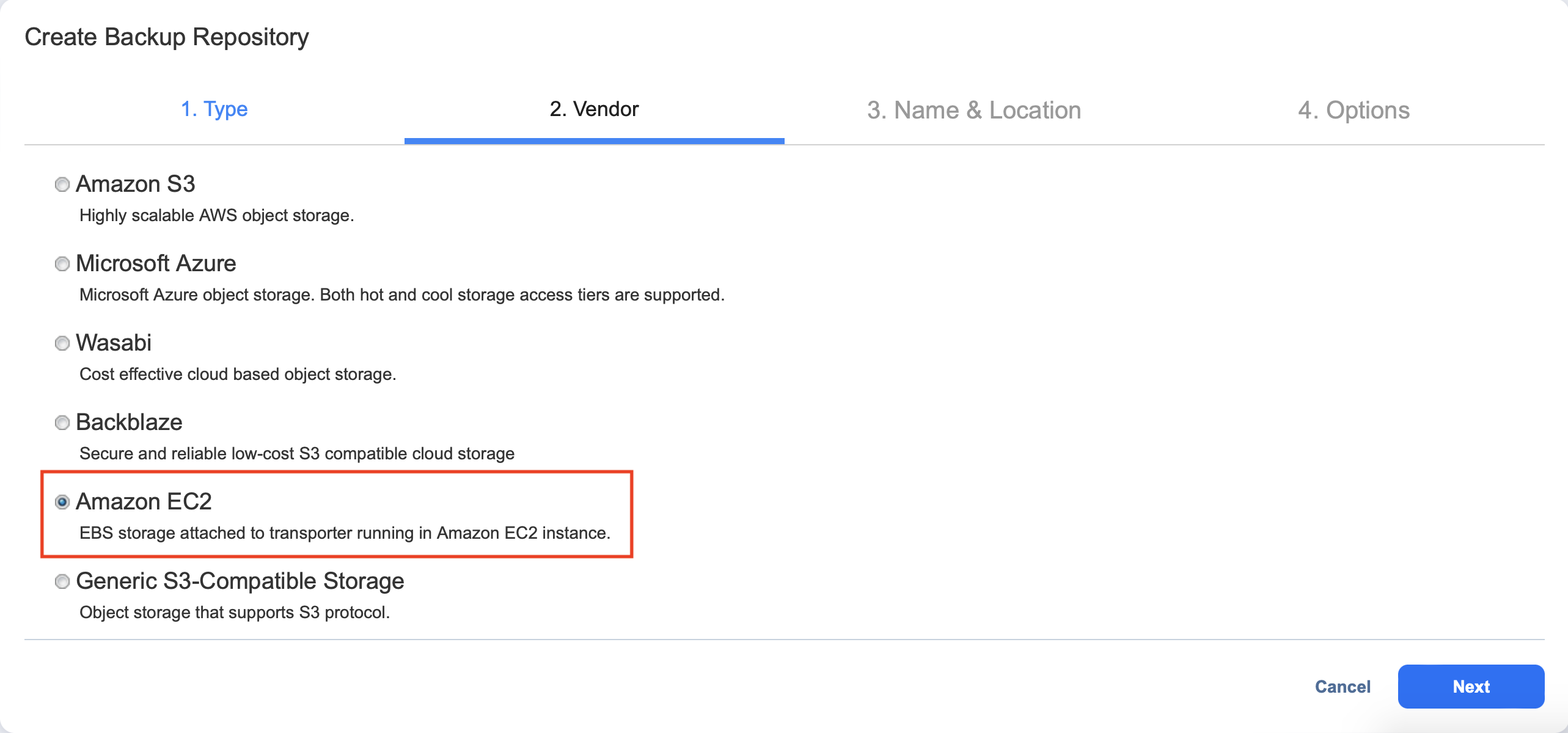 Elija esta opción si desea crear un Repositorio de backups en Amazon EC2. El Repositorio de backups se creará en la misma región donde se encuentre el Transportador asignado.