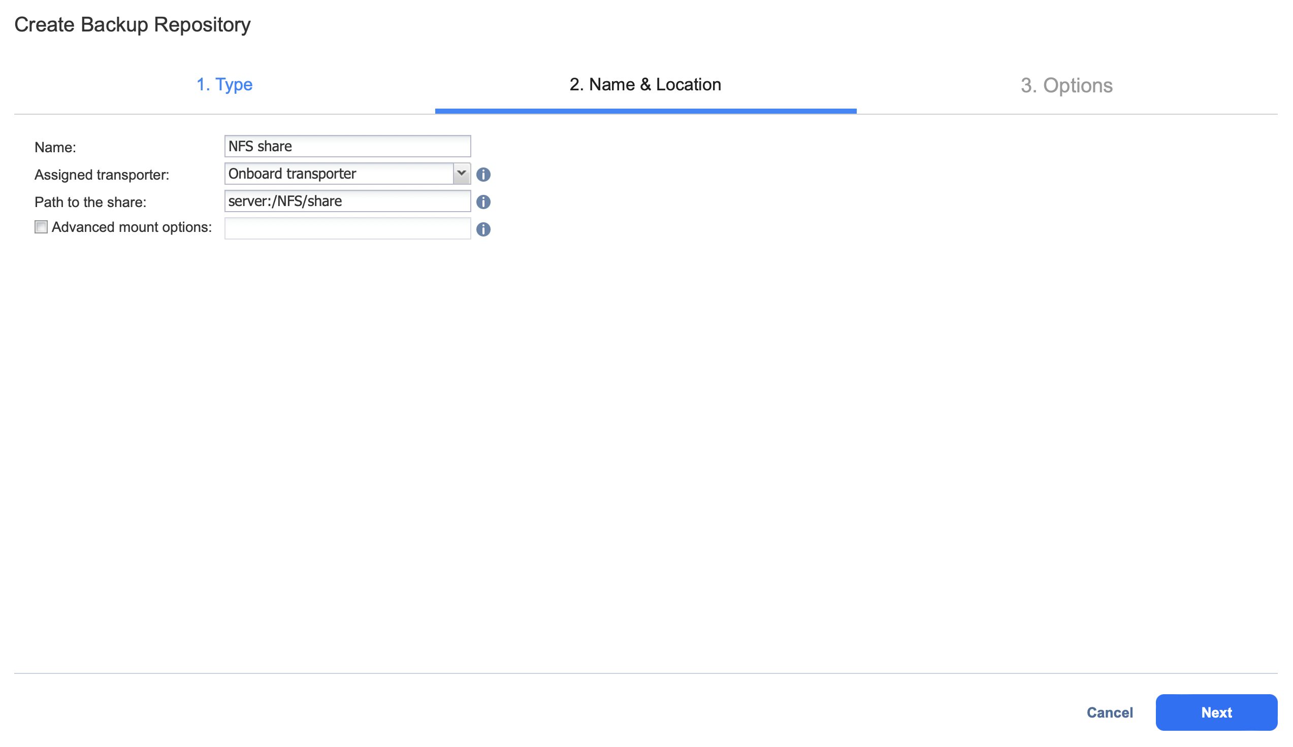 Elija esta opción si desea crear un Repositorio de backups en un recurso compartido NFS. Antes de crear un repositorio de backups en un recurso compartido NFS, asegúrese de que se cumplen todos los requisitos previos necesarios:
