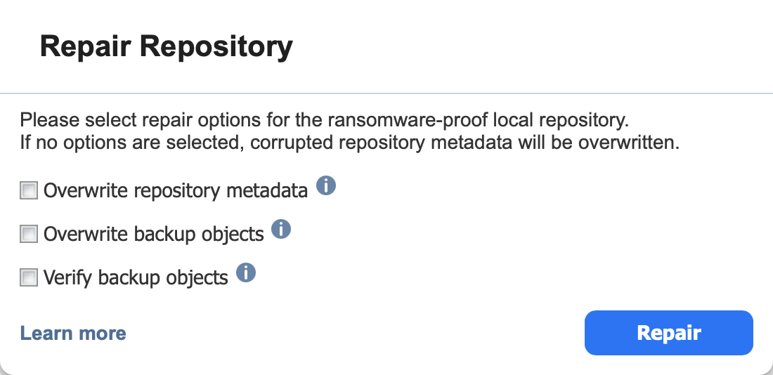 En caso de que un backup inmutable o el propio Repositorio de backupsesté dañado, es posible iniciar un proceso de reparación. Durante este proceso, NAKIVO Backup & Replication intenta revertir el Repositorio de backups o un backup específico a su estado incorrupto.
