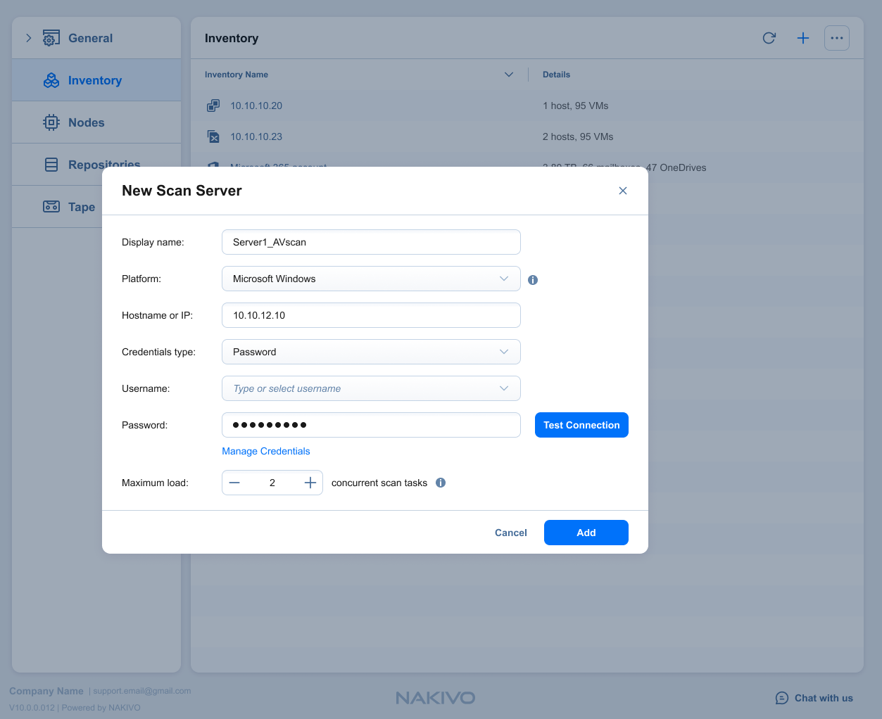 7. Haga clic en Probar conexión para asegurarse de que NAKIVO Backup & Replication puede conectarse correctamente a su servidor de backup.