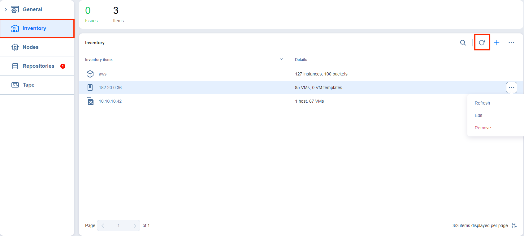NAKIVO Backup & Replication conserva la información sobre la infraestructura detectada en su base de datos interna, que se actualiza cada 1 hora por defecto. Durante la actualización del inventario, el producto recopila toda la información necesaria sobre su infraestructura virtual, como una lista de hosts y máquinas virtuales, su estado de energía, etc.