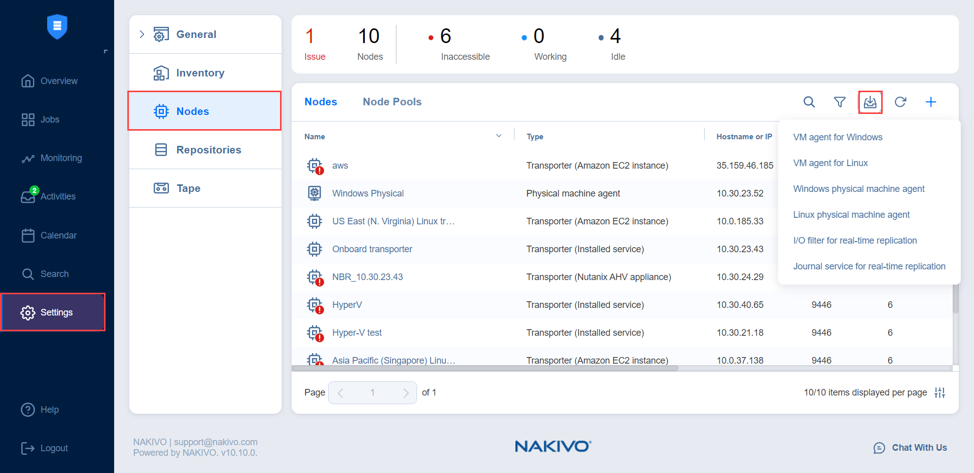 Puede descargar los archivos de instalación del agente de máquina virtual (VMA) desde la interfaz de usuario de la aplicación. Para ello, vaya a Ajustes > Nodos, haga clic en el botón Descargar y seleccione el sistema operativo necesario.