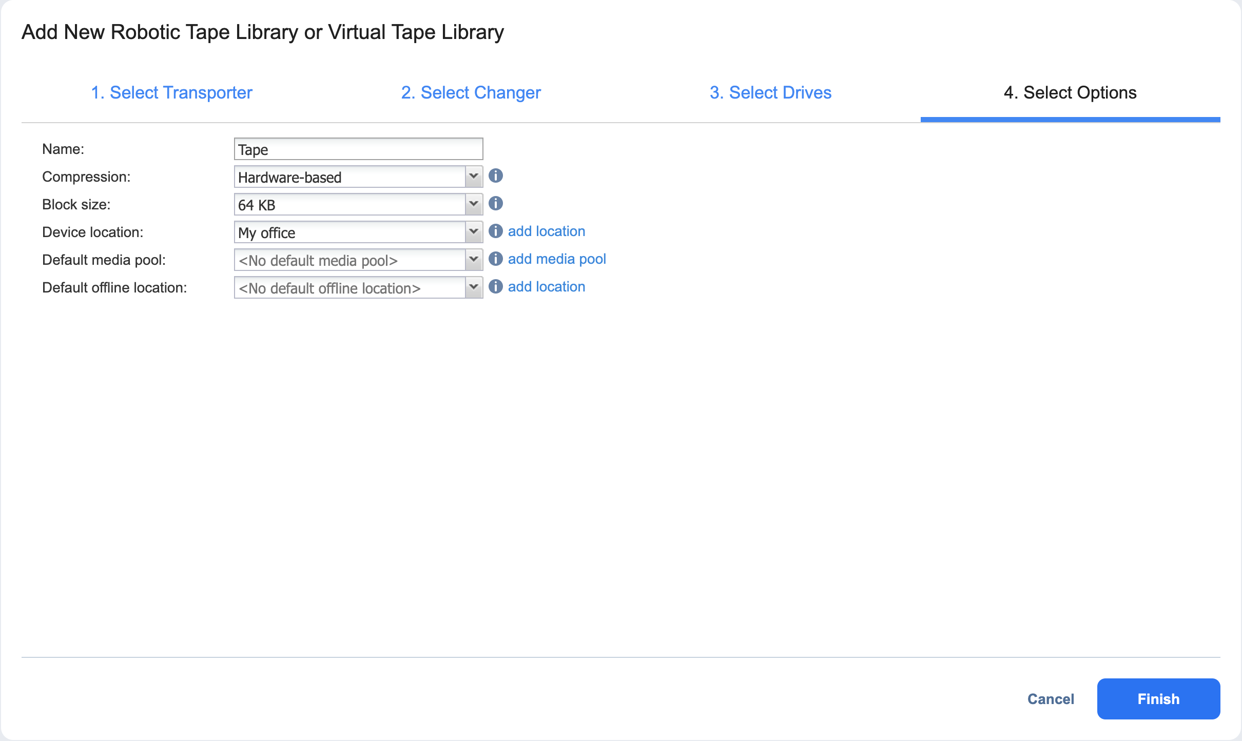 El Último paso para añadir una biblioteca de cintas es seleccionar sus opciones.