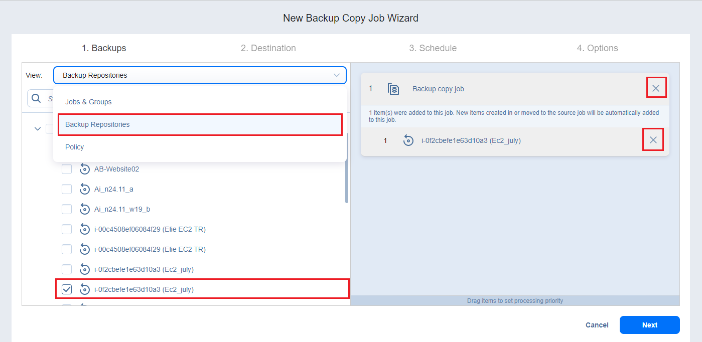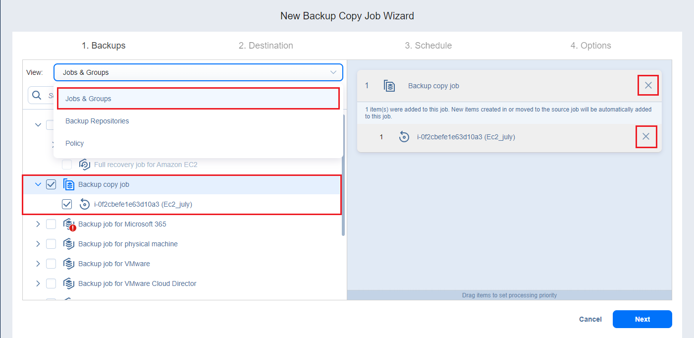 Review the list of the selected items. If needed, remove a selected backup in the backup copy job in either of the following ways: