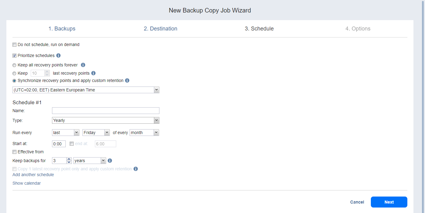 Prioritize schedules: When this option is selected, NAKIVO Backup & Replication starts treating schedules based on their priority. The Yearly schedule will have higher priority than the Monthly schedule, etc. In case 2 or more schedules overlap, the schedules with lower priority will be skipped.
