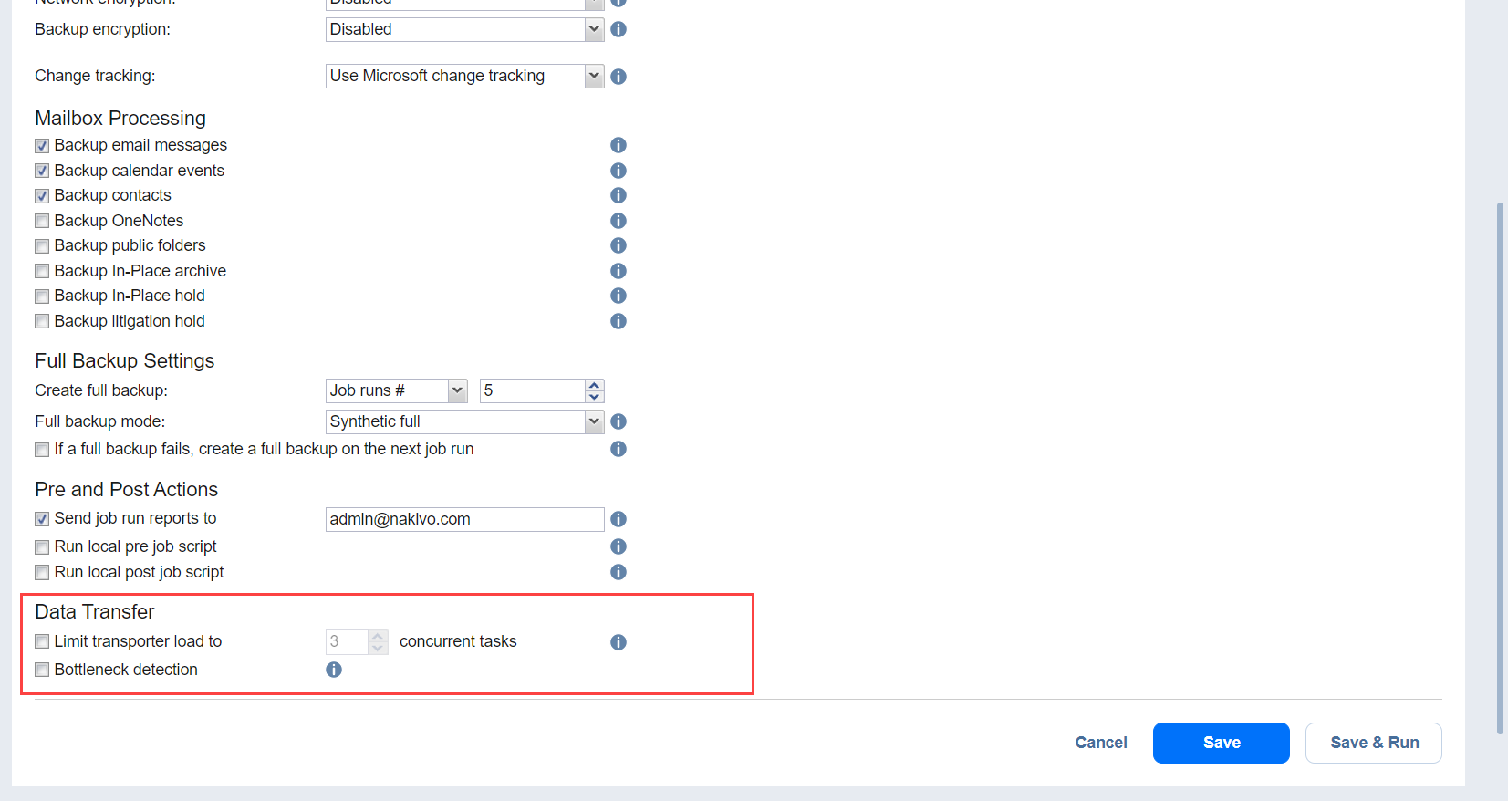When the Bottleneck detection option is enabled, additional information is collected and recorded in NAKIVO Backup & Replication logs in the course of data transfer for the purpose of bottleneck detection. Check this option to enable the Bottleneck detection capability of the Transporters engaged in the job.