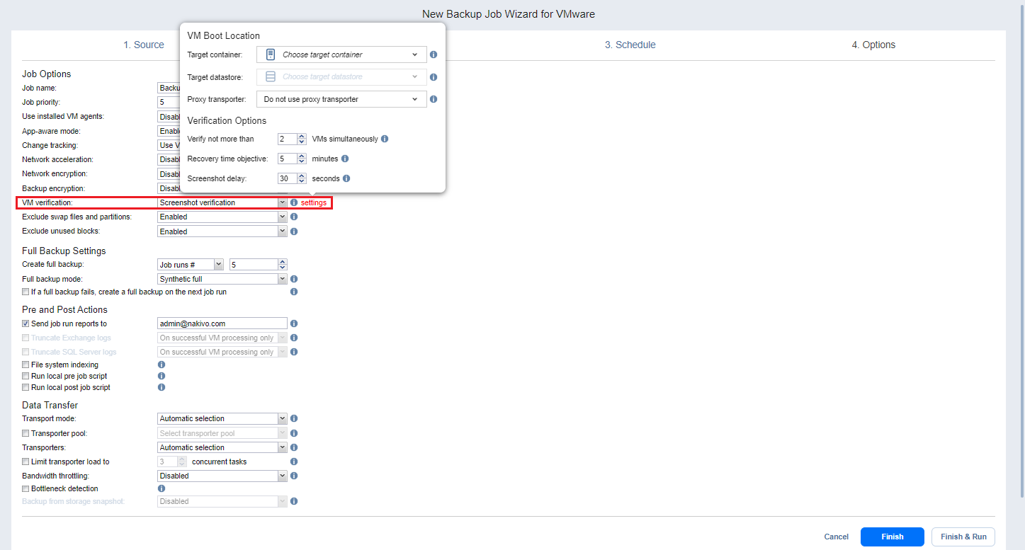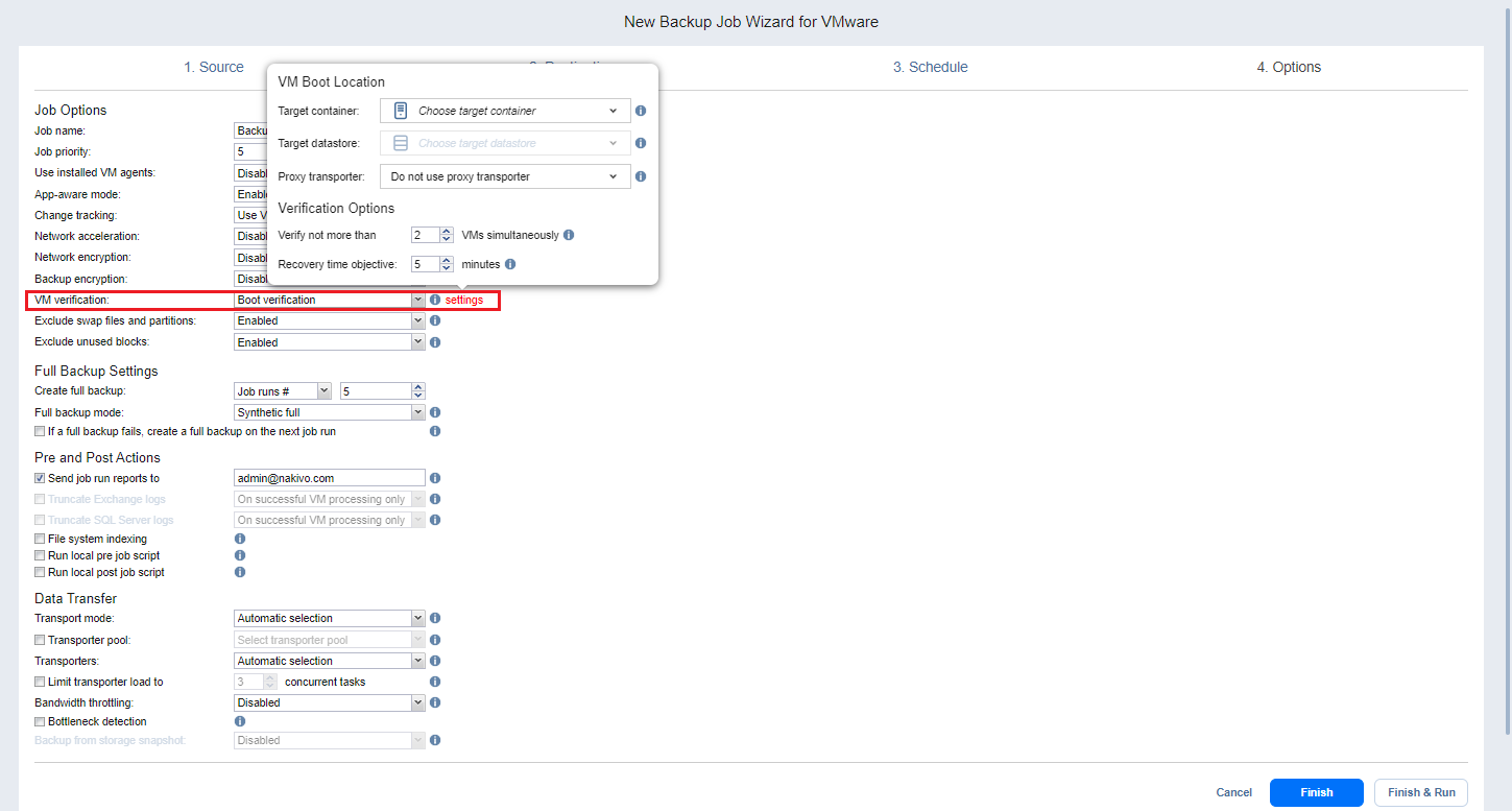 • Boot verification: When enabled, all VM backups created by the job are verified as follows. After a VM backup is completed, NAKIVO Backup & Replication recovers the VM using Flash boot, disables networking to prevent network connections, and verifies that system start is successful.