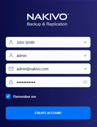 When you open the NAKIVO Backup & Replication login page for the first time, you are prompted to create a new user account. This user account is the admin account to be used to access your instance of NAKIVO Backup & Replication. Fill out the fields in the form: