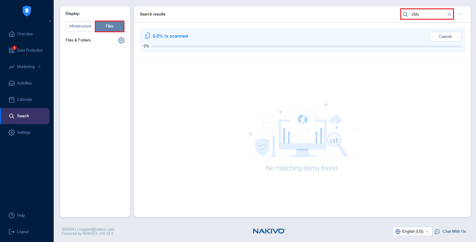 Using the Global Search dashboard, search for items within the entire inventory of NAKIVO Backup & Replication, Transporters, Backup Repositories, jobs, backups, and replicas.