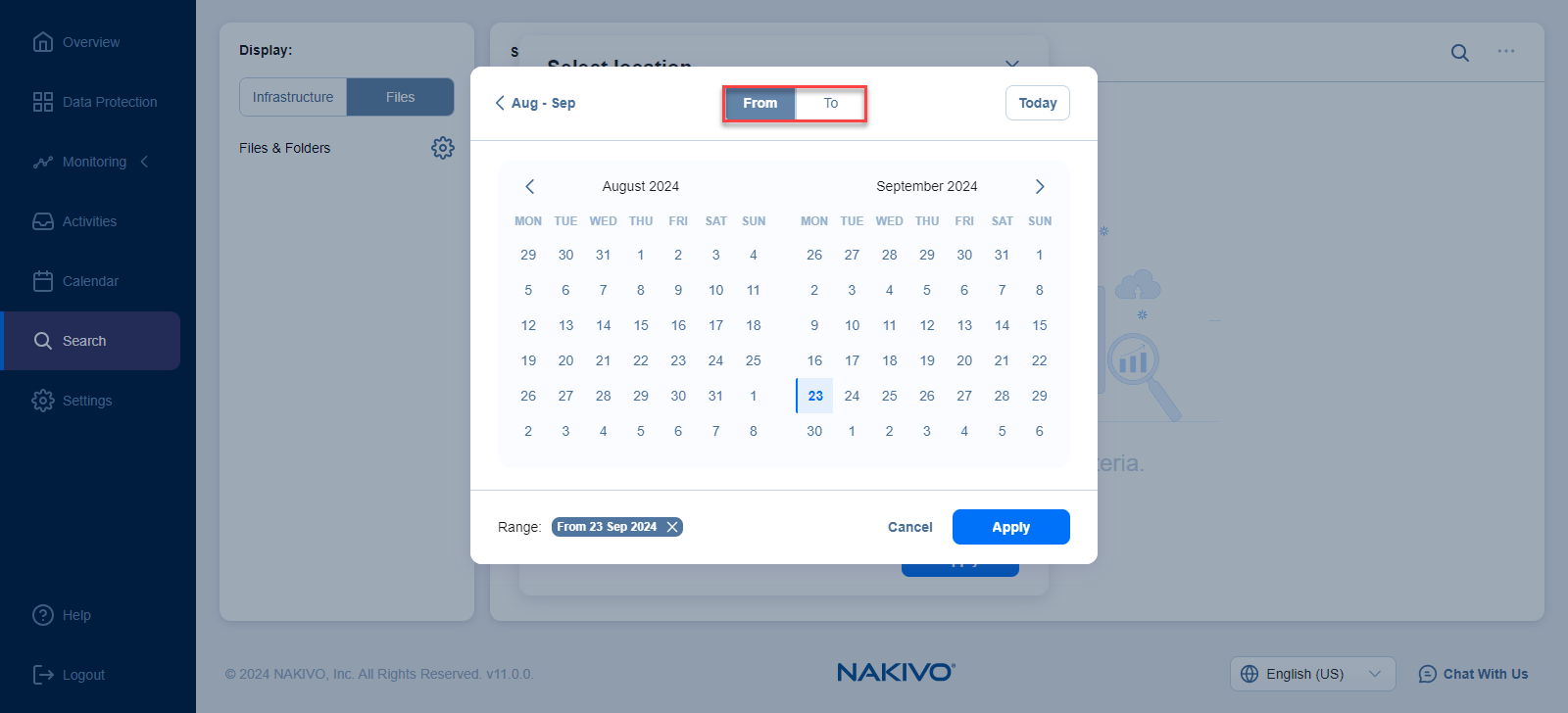 Open the date picker dropdown and set the needed search range by navigating between the From and To panes.