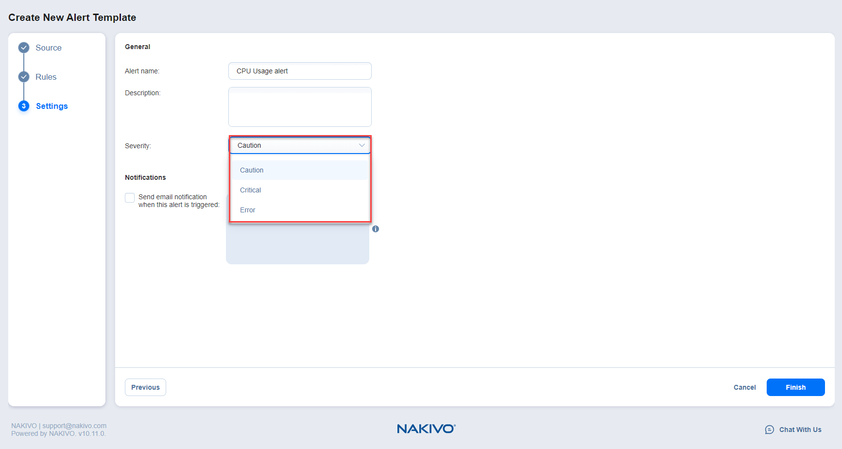 At the Settings step of the wizard, you can specify the alert name and severity. You can also enable email notifications for triggered alerts: