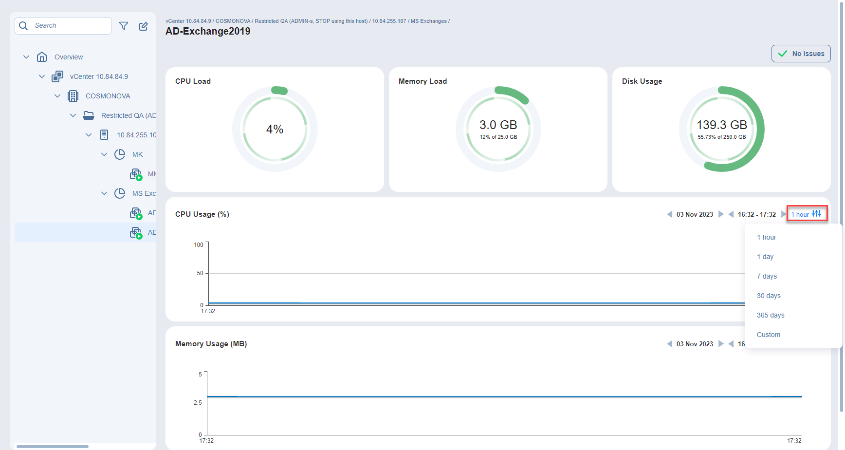You can specify time frames for the displayed historical CPU, memory, and disk usage line charts. To do so, click on the controls icon on the right for the needed chart and choose one of the following options: