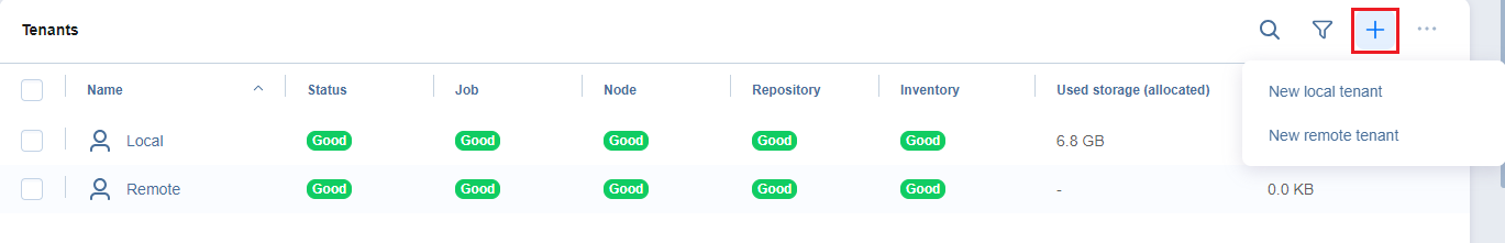 Added standalone NAKIVO Backup & Replication instances are visible in the Tenants Dashboard as remote tenants. To learn how to create new remote tenants by using the Tenants Dashboard, refer to Creating a Remote Tenant.