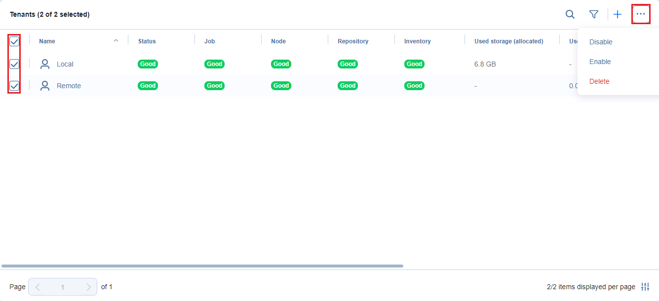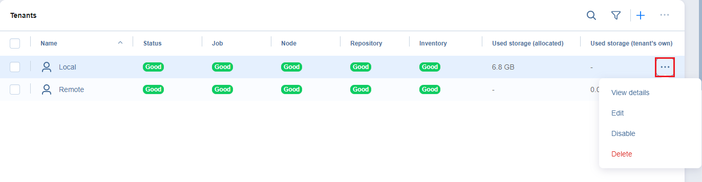 In the Tenants table, you can edit, disable, enable, or delete tenants.