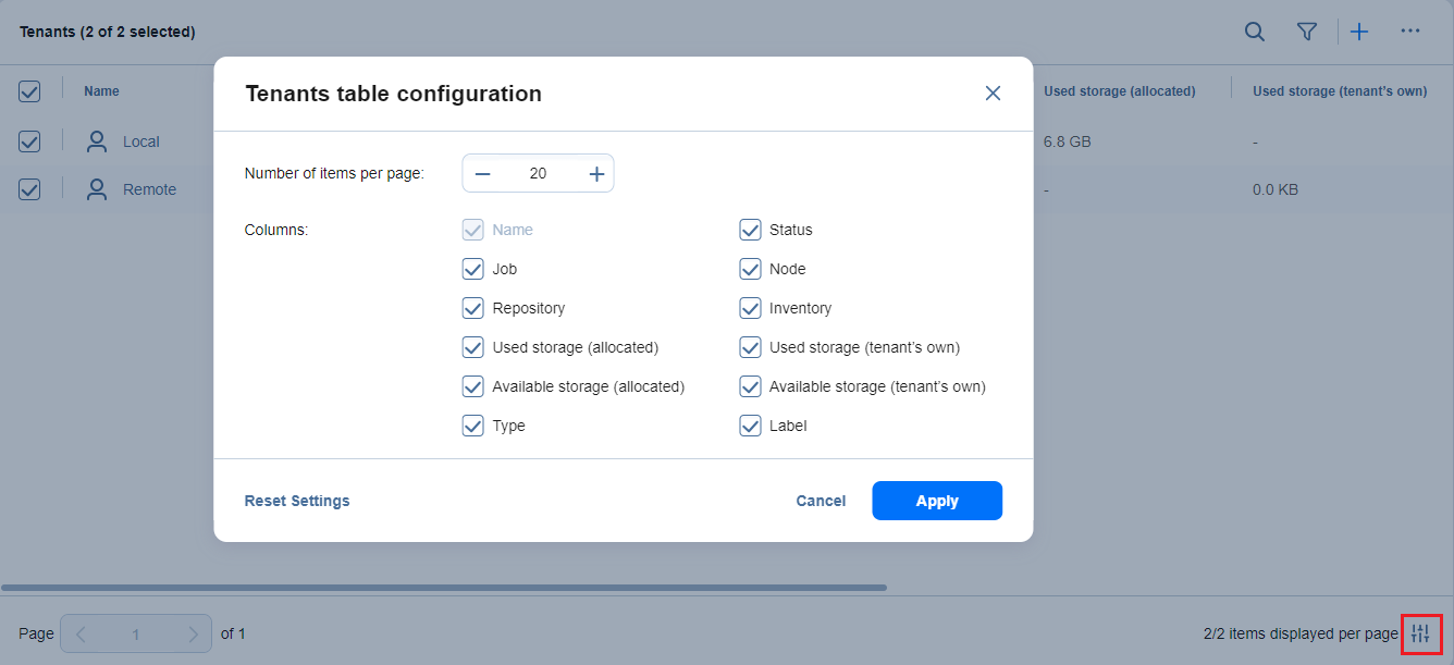 Optionally, you can show/hide columns or modify the number of items per page in the Tenants table configuration table. In the lower right corner, click the controls icon. In the dialog box that opens, select/deselect checkboxes and click Apply.