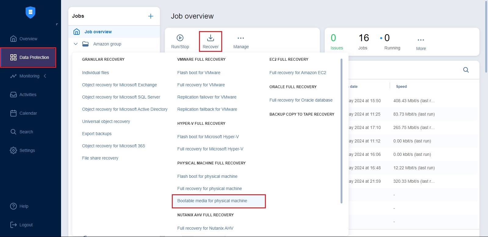 To open the Bootable Media wizard from the Data Protection dashboard, click Recover and select Bootable media for physical machine. Note that this option only appears in the Data Protection dashboard if you have successfully completed an existing physical machine backup job.