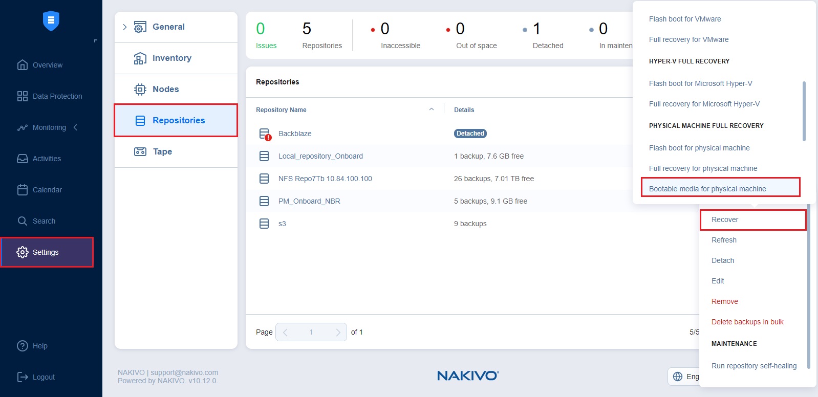 To open the Bootable Media wizard from the Repositories tab, click the ellipsis Manage button, click Recover, and select Bootable Media for physical machine.