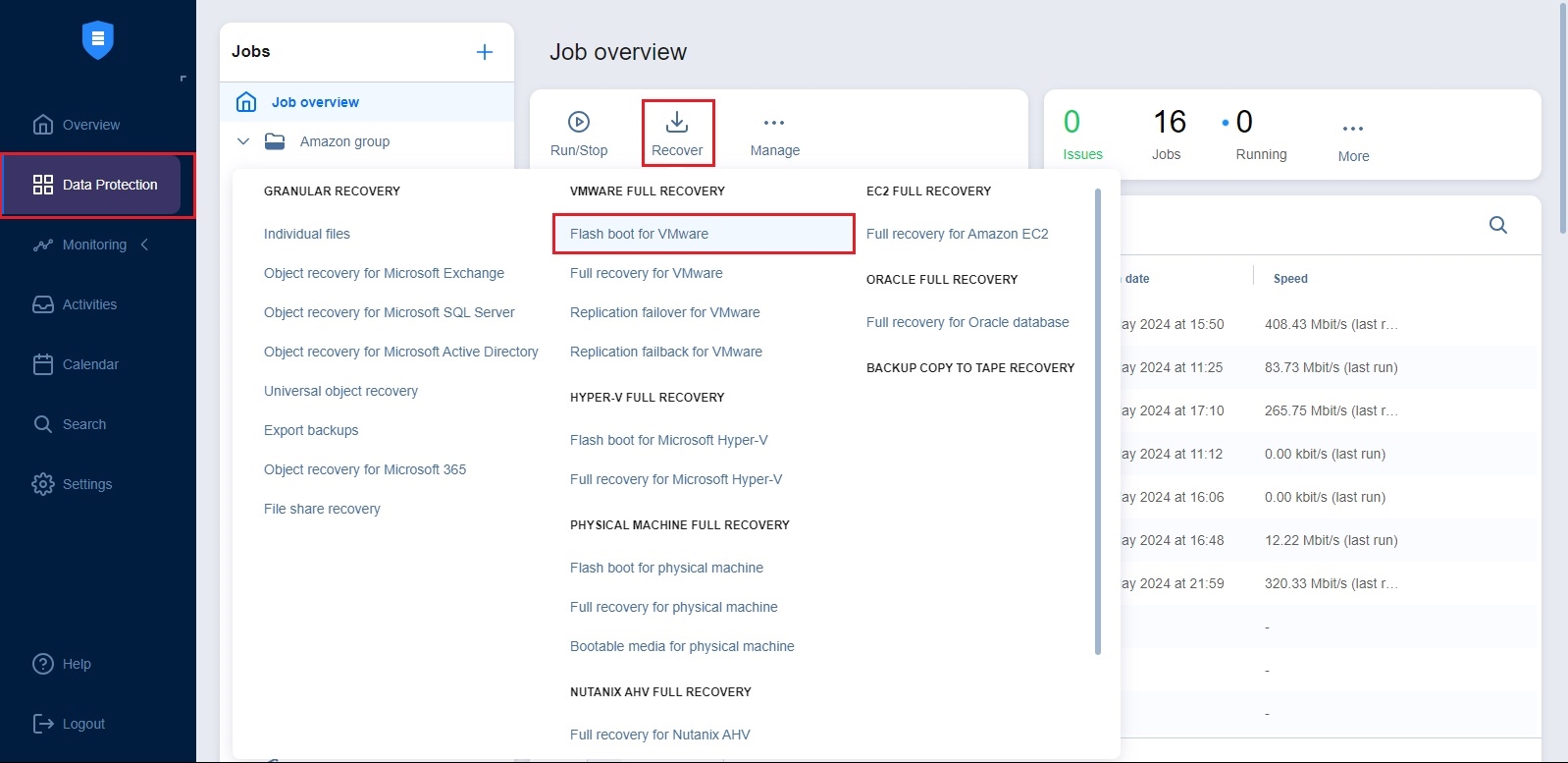 • Open the Flash Boot wizard from the Data Protection menu by clicking Recover and then clicking Flash boot for VMware.