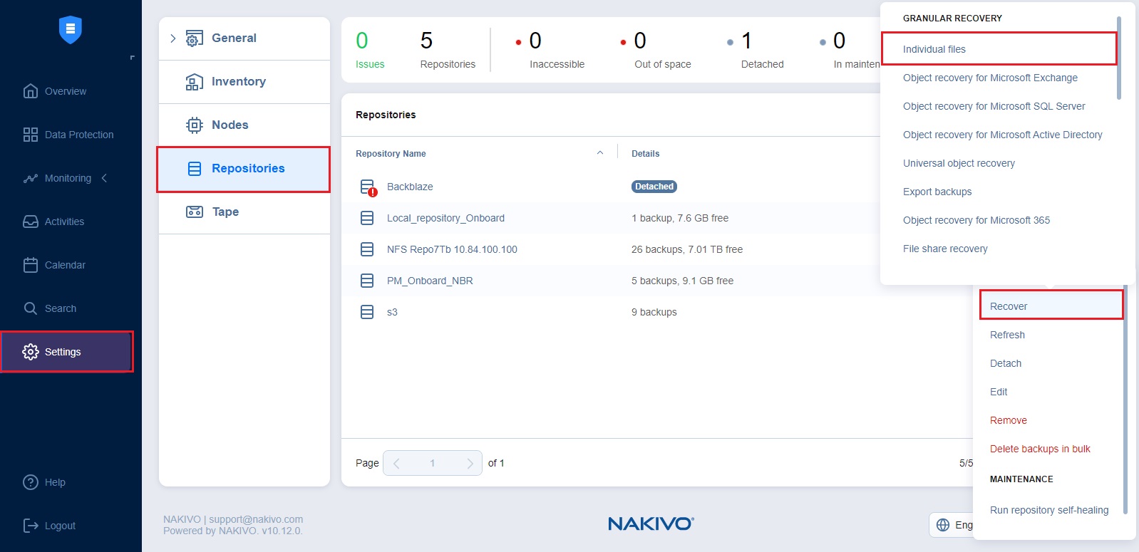 You can start the recovery process either from the Data Protection menu, by using the Search function, or from the Repositories tab in Settings  (for example, if you no longer have a backup job, but still have the backup). Refer to the following sections for more details: