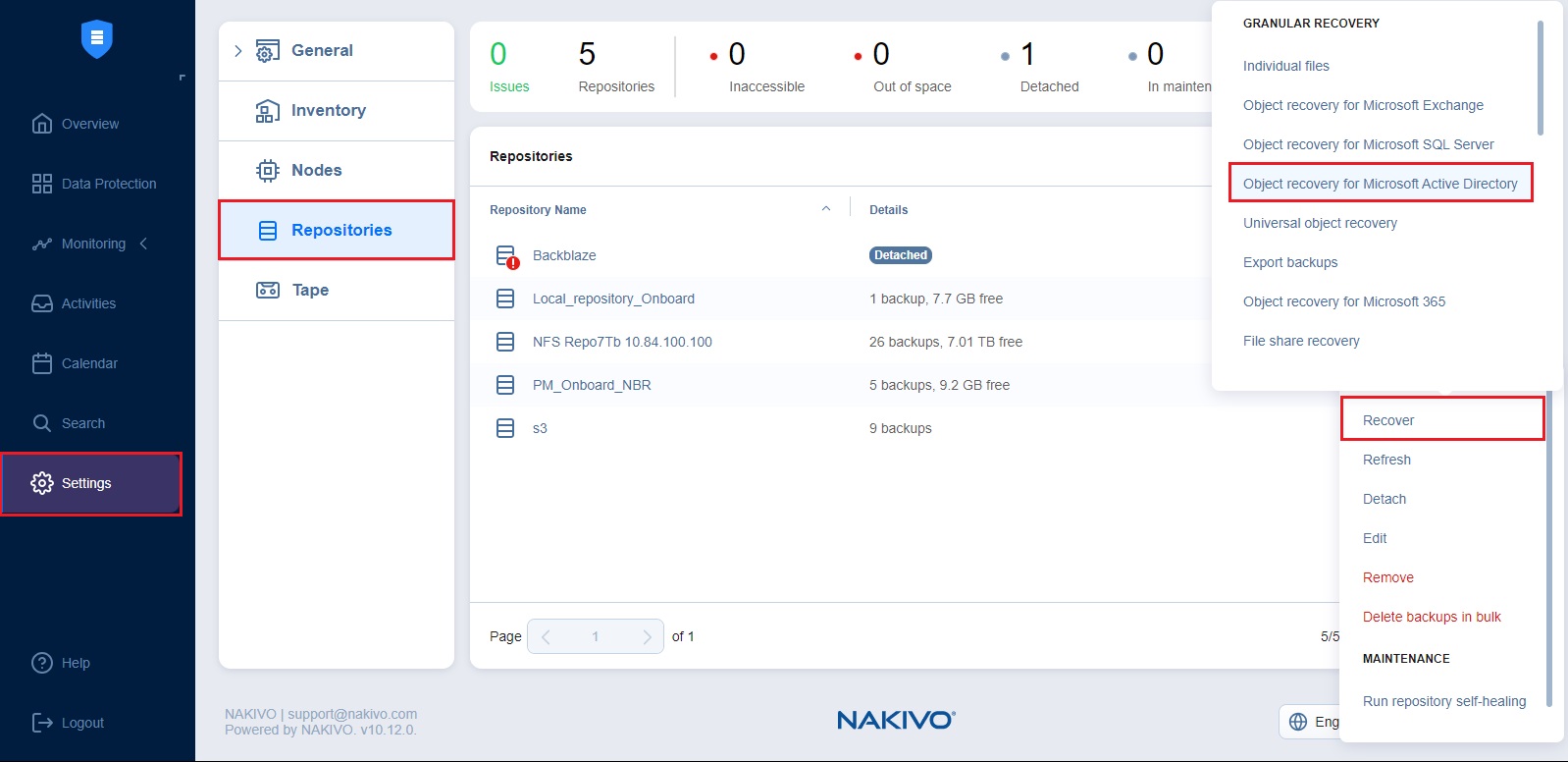 You can start the recovery process either from the Data Protection menu, by using the Search function or from the Repositories page in Settings (for example, if you no longer have a backup job, but still have the backup). Refer to the following sections for more details: