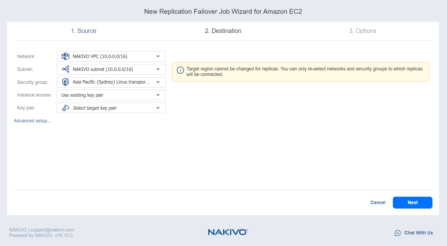 Failover Job Wizard for Amazon EC2: Destination