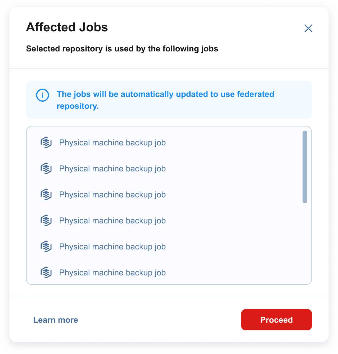 4. If the selected member is used as a destination for existing jobs, the Affected Jobs dialogue is displayed with the list of jobs using the selected repository as a destination or source. Click Proceed to lock the selected repository before adding it as a new member and update the jobs after the federated repository is created.