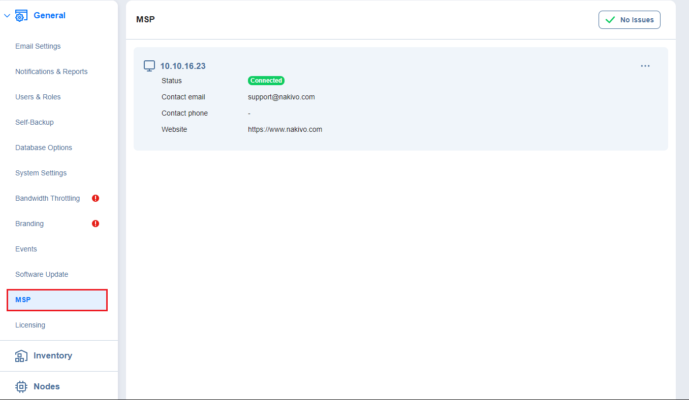 Once the MSP is added, you have successfully established a connection with the Master tenant as a remote tenant. This allows the Master tenant to access your instance of NAKIVO Backup & Replication as long as the connection is active.