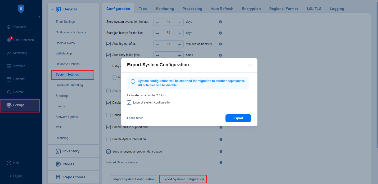 Backup Repositories are not migrated by the system configuration export and import. If you have a local Backup Repository on the old instance of the product, you may want to move it to the new location. After moving the Backup Repository, you may need to edit Backup Repository settings in the new instance so that the new settings refer to the actual Backup Repository location.