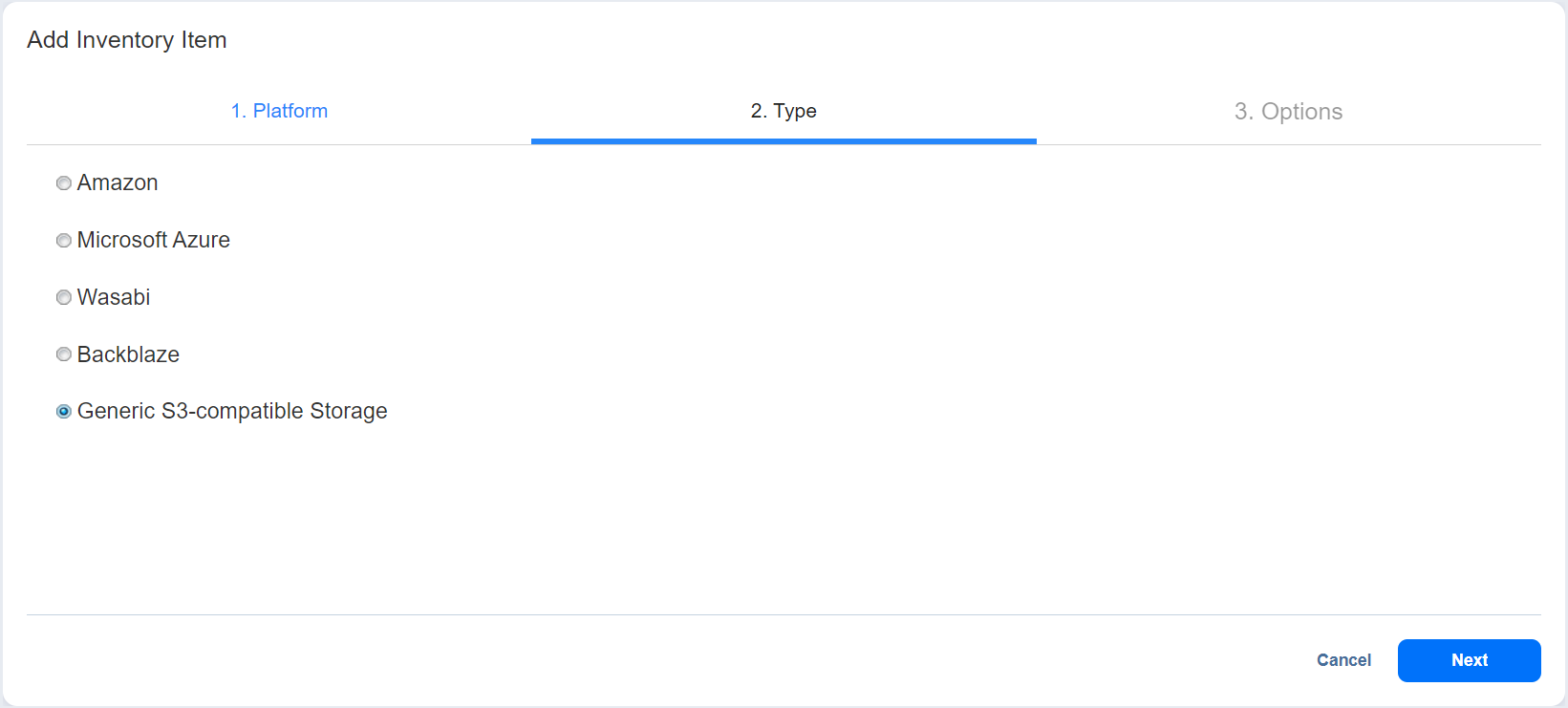 5. On the Type page of the wizard, select Generic S3-compatible Storage and click Next to proceed.