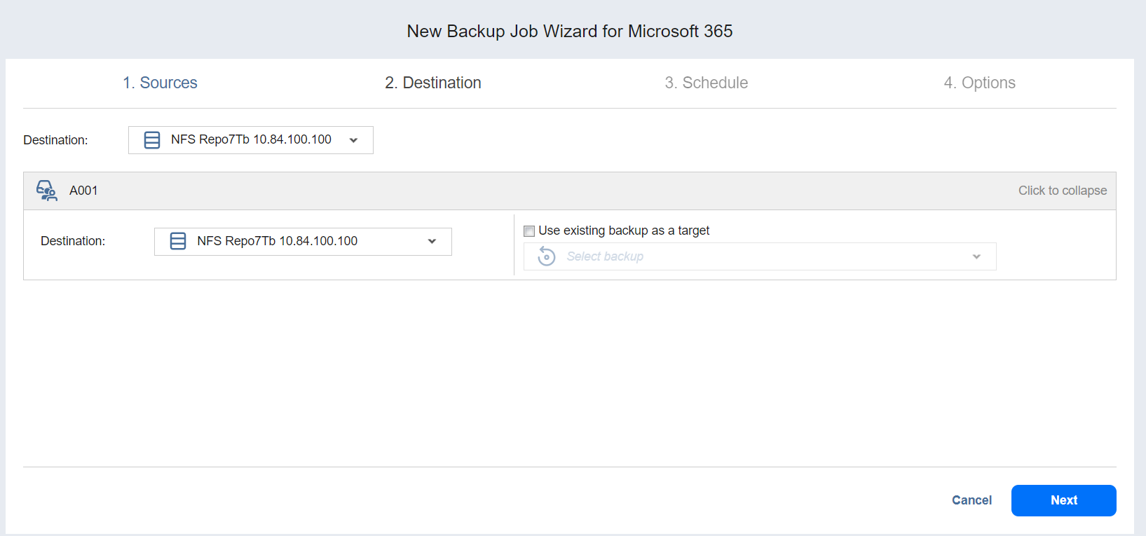 To back up all items selected on the Sources page to a single Backup Repository, choose a Backup Repository from the Destination drop-down list.
