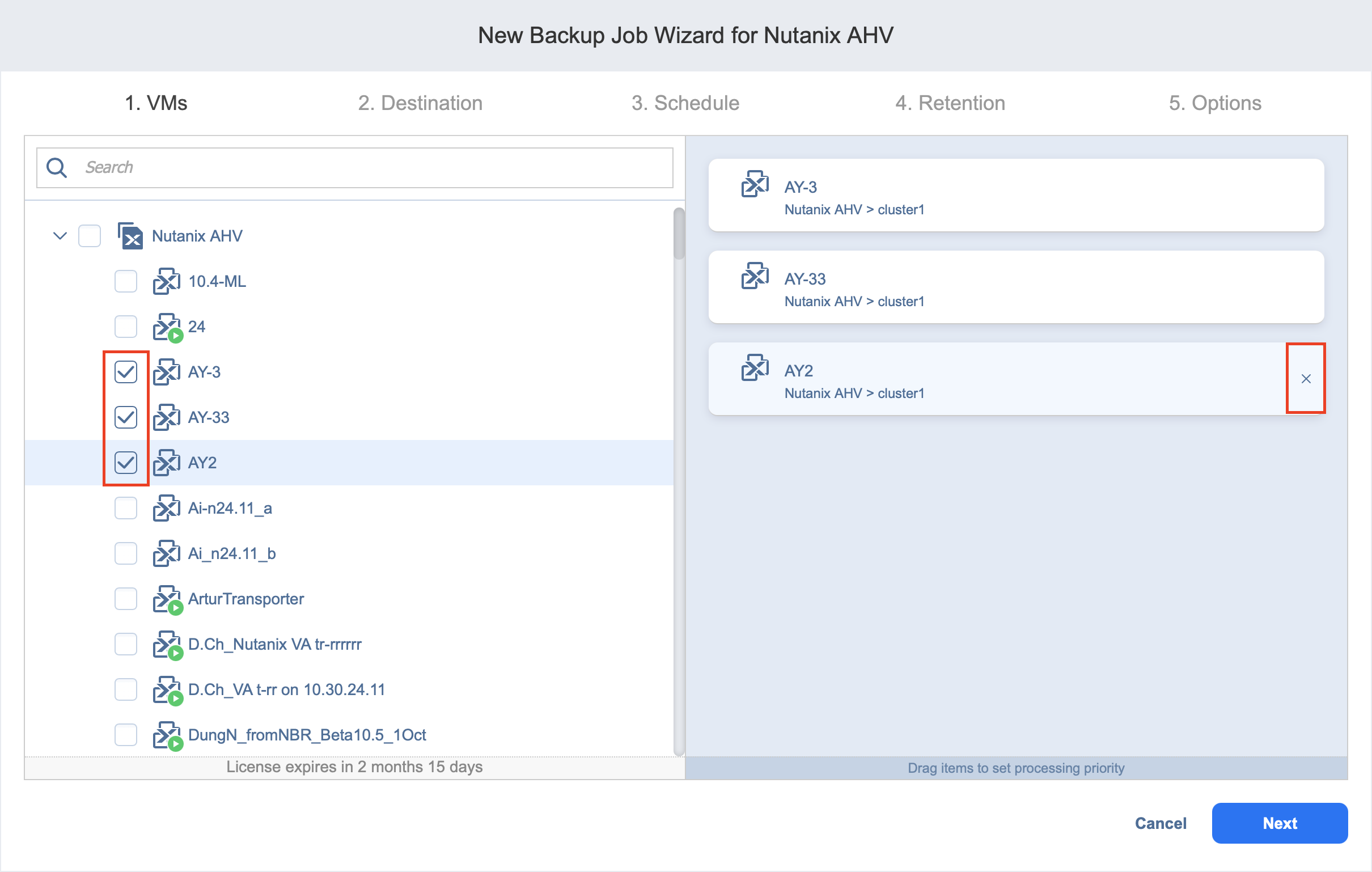 Exclusion: If necessary, you can exclude VMs from the backup by deselecting them in the left pane or by clicking the Delete icon to the right of the VM’s name in the right pane.