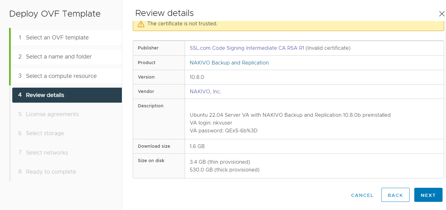 The Virtual Appliance (VA) has two disks: the first (30 GB) contains a Linux OS with NAKIVO Backup & Replication, and the second (500 GB) is used as a Backup Repository. If you deploy the Virtual Appliance disks using the Thin Provision option, then the disks will not reserve space on your datastore and will only consume space when actual data (such as your backups) is written to disks.