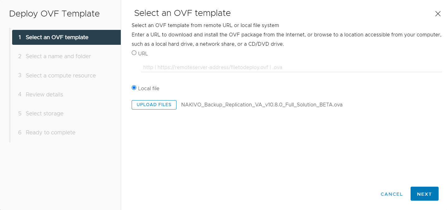 On the Select an OVF template page of the Deploy OVF Template wizard, select Local file and upload the VA file (.ova) you've downloaded. Click Next.