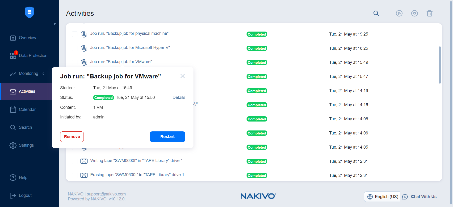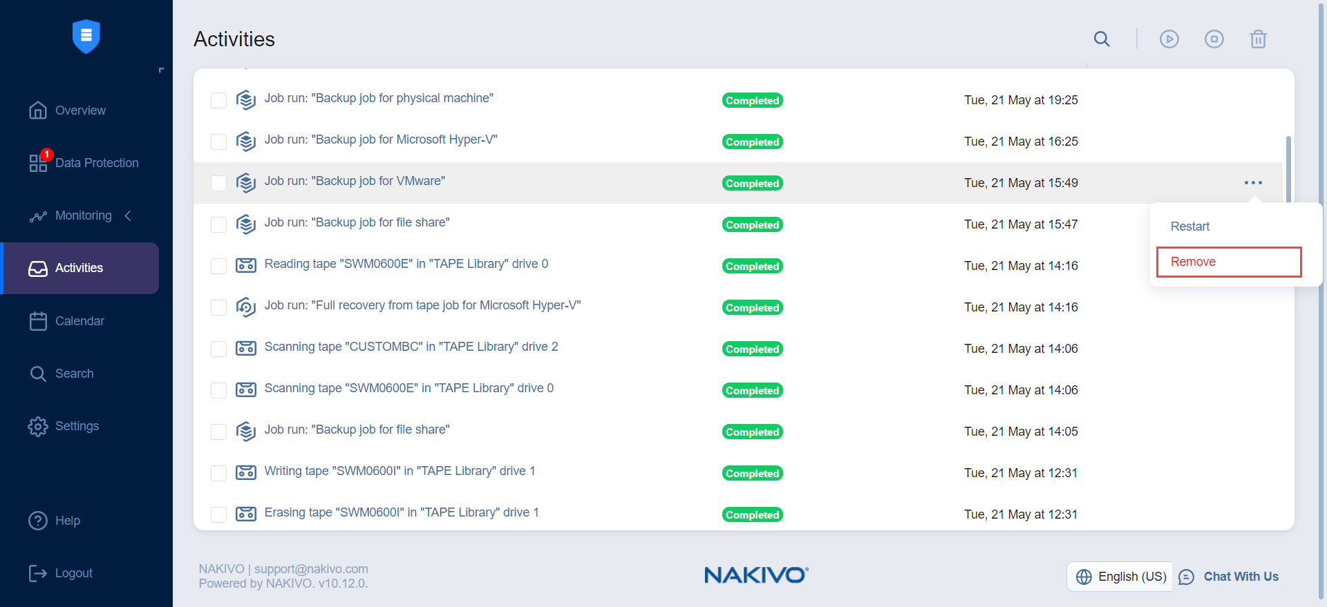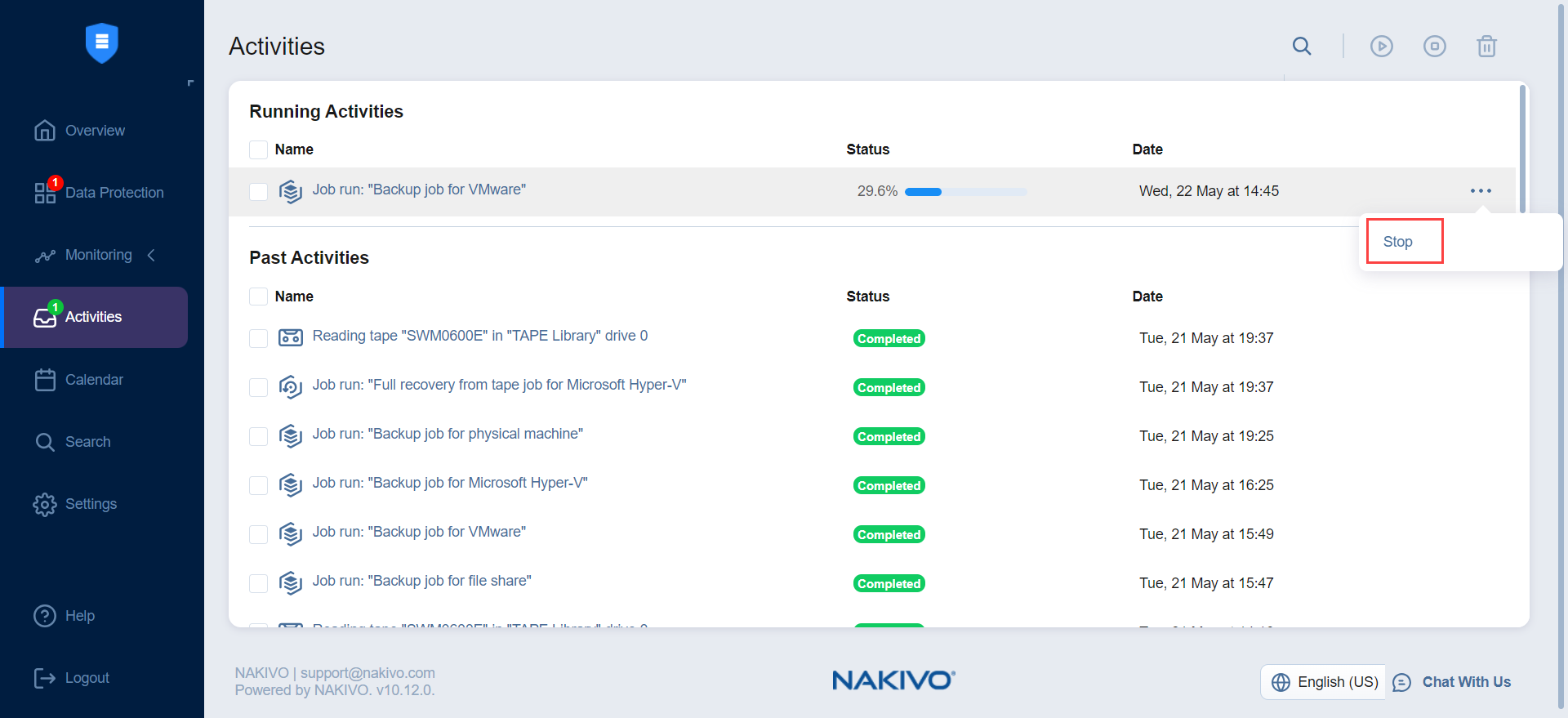 The Activities page displays current and past tasks performed by NAKIVO Backup & Replication. From this dashboard, the following actions can be done: