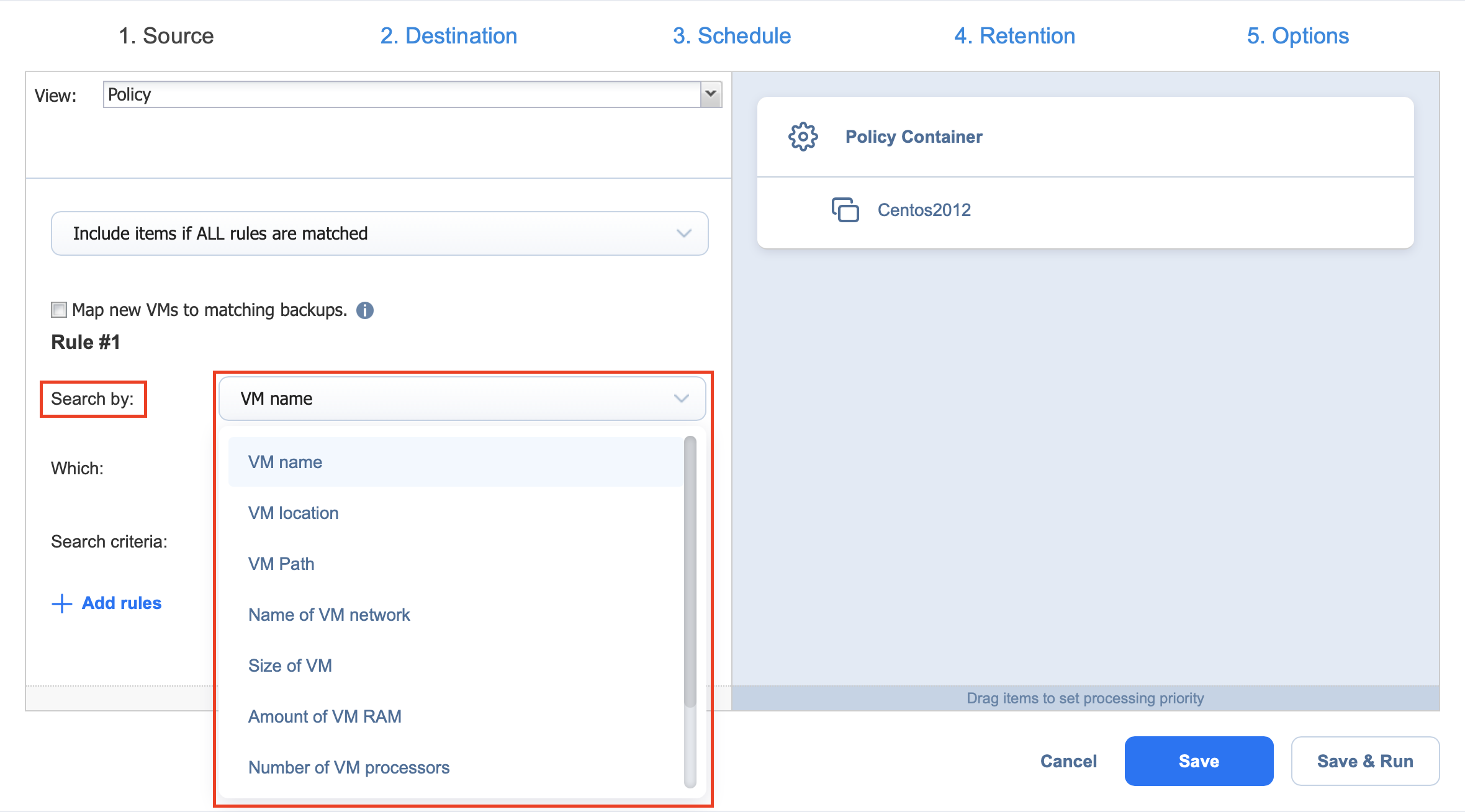 • VM / VM Template / Instance / Backup / Replica / Machine name: The rule is to be applied based on the name of the object.