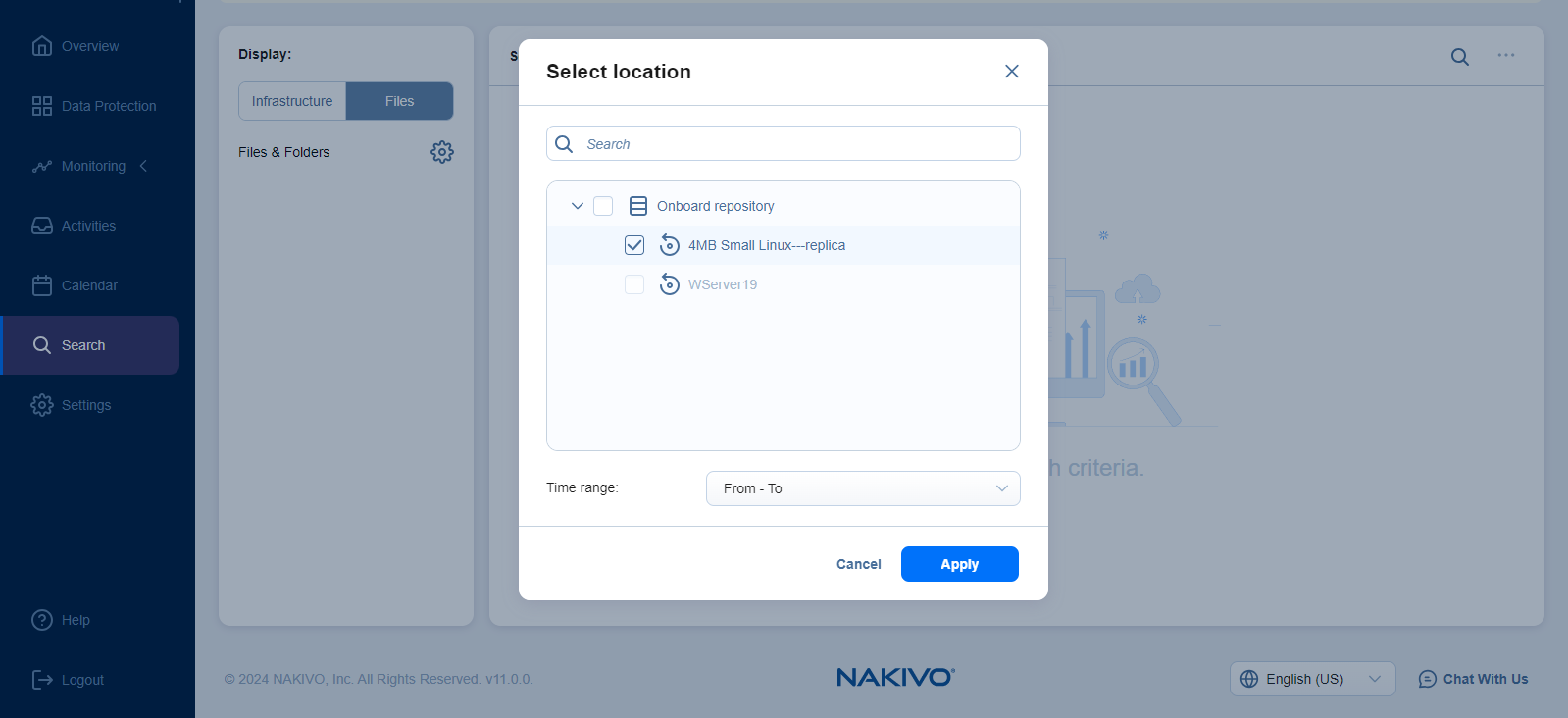 Using the Global Search dashboard, search for items within the entire inventory of NAKIVO Backup & Replication, Transporters, Backup Repositories, jobs, backups, and replicas.