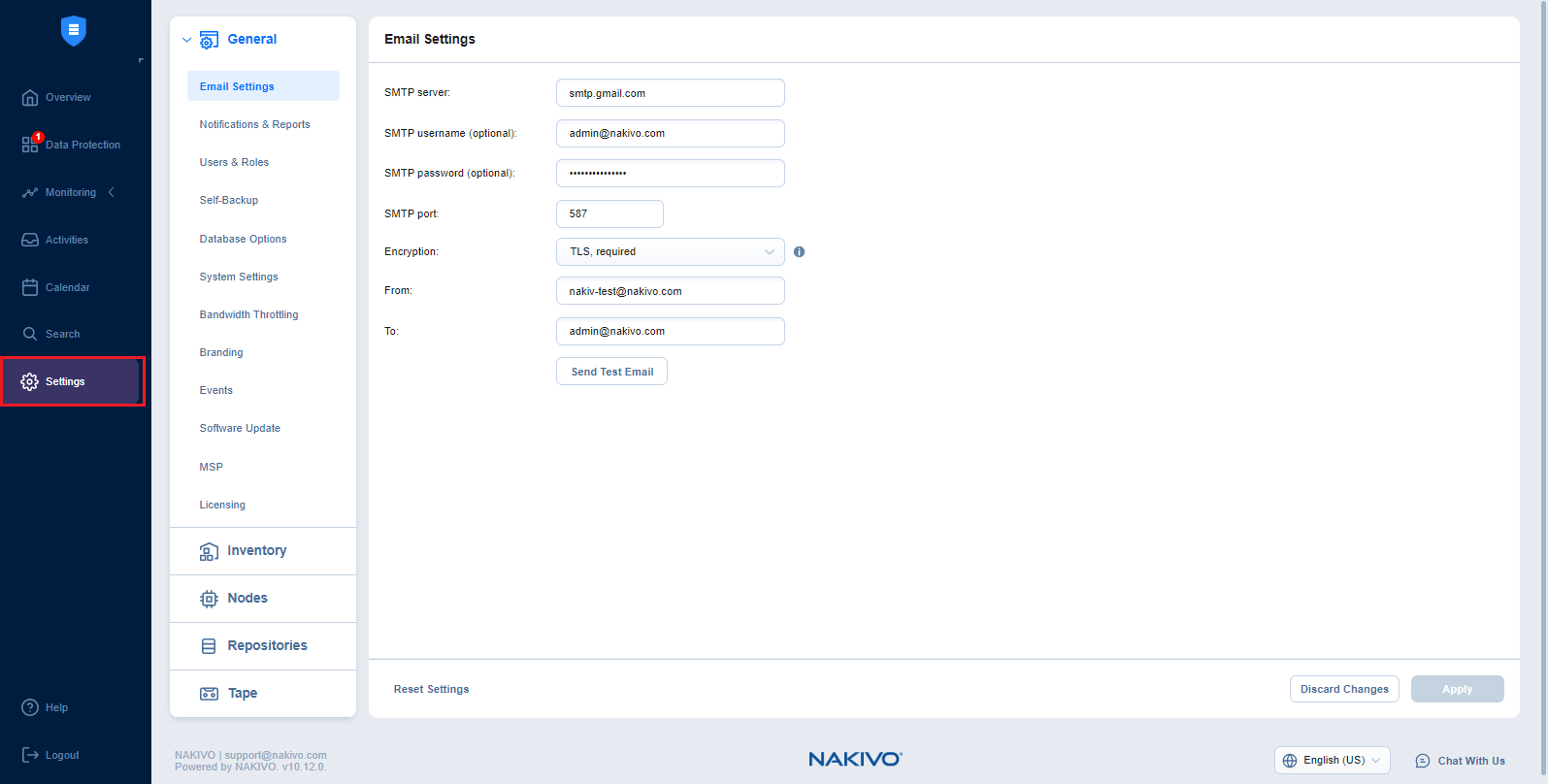 On the Settings page, you can configure NAKIVO Backup & Replication General, Inventory, Transporters, Repositories, and settings. Refer to Settings for more detailed information.