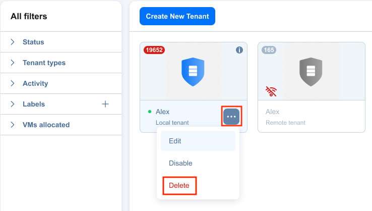 To permanently delete a tenant from the product, hover over the tenant card and click the ellipsis Manage button, then click Delete.