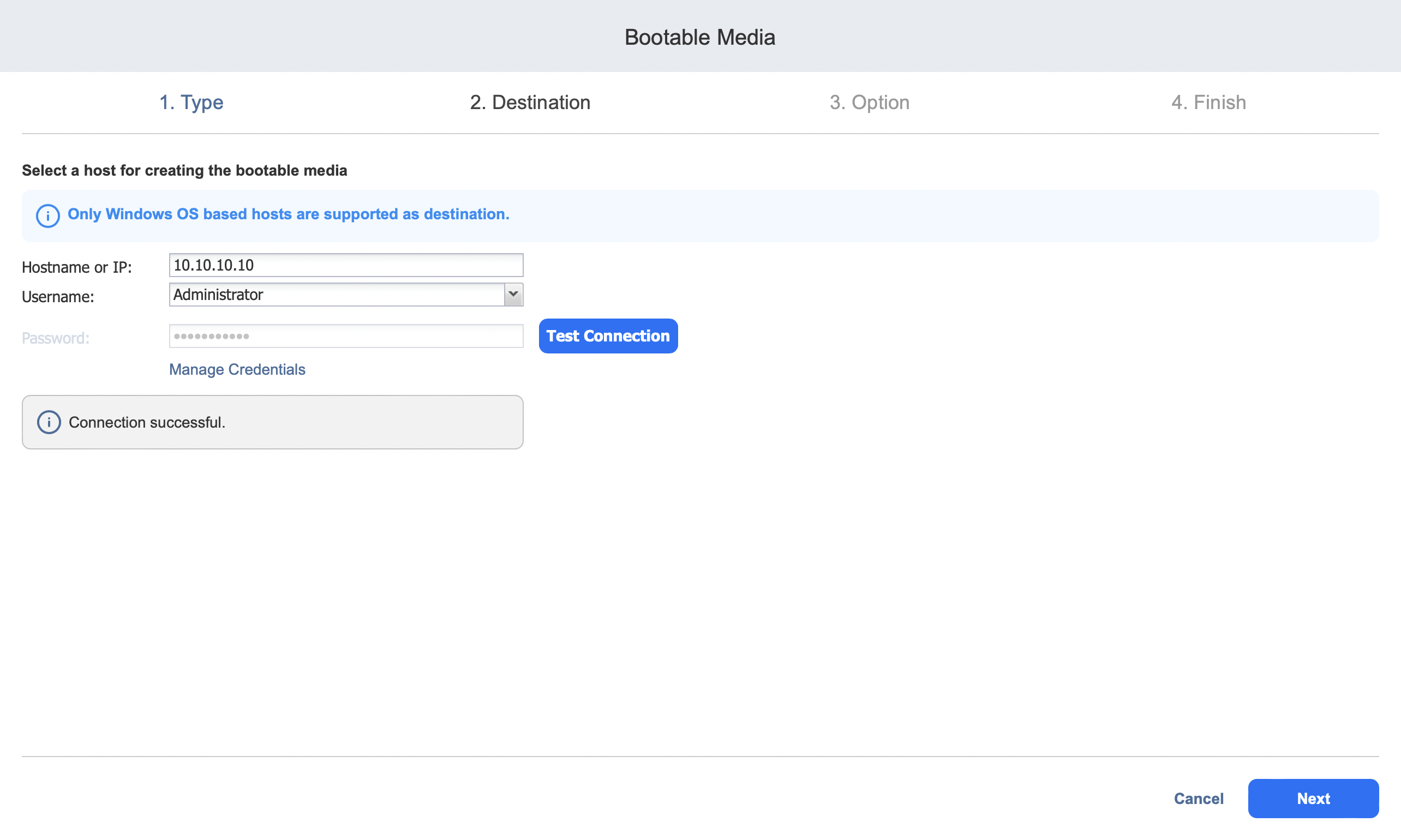 Hostname or IP: Input the hostname or IP address of the host to be used as the destination for the creation of bootable media. Note that only Windows OS-based hosts are supported as the destination.
