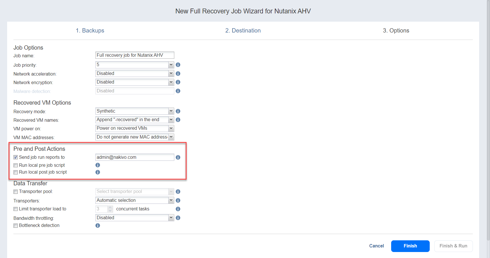NAKIVO Backup & Replication allows you to run a script before VM recovery begins (a pre-job script) and after the recovery of all VMs in the job has completed (a post-job script). The scripts can only be executed on the machine where the Director is installed.