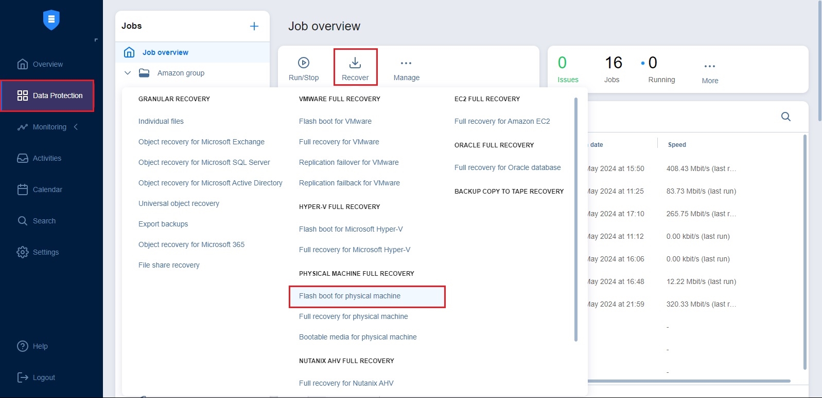 Create a Flash boot job from the Data Protection menu by clicking Recover and then selecting Flash boot for physical machine.